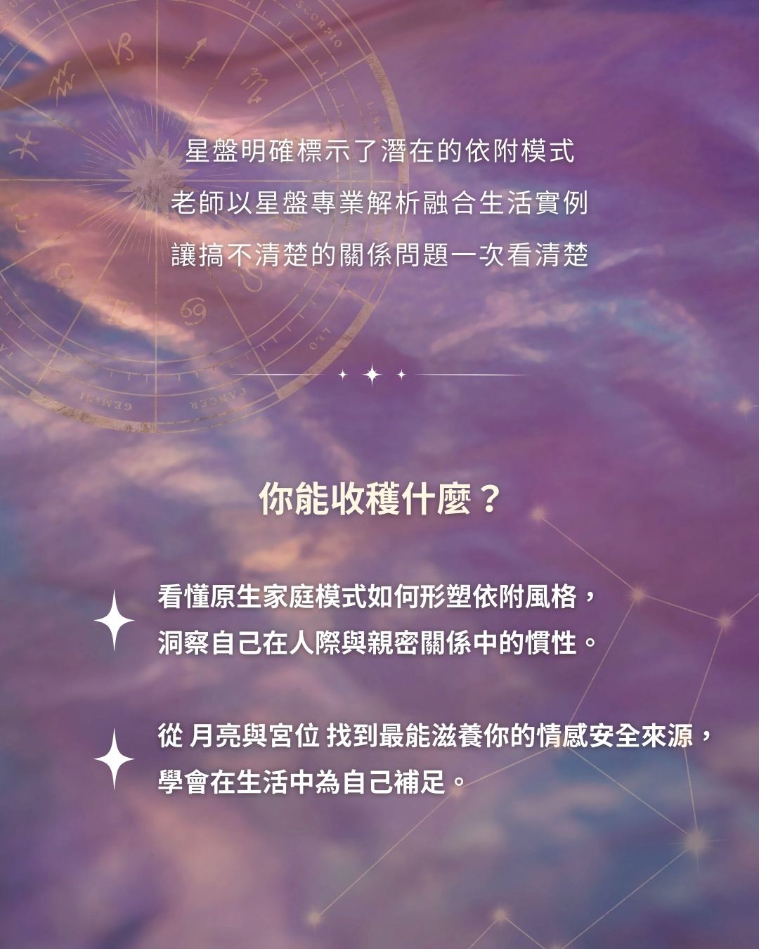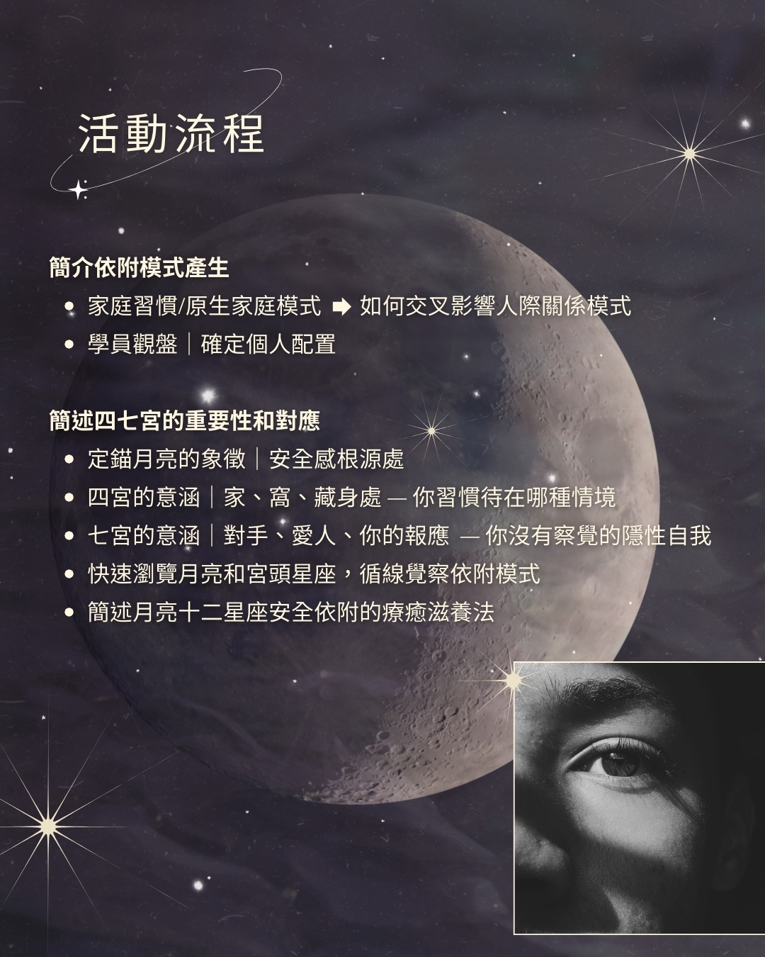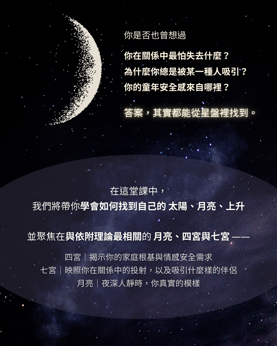 活動介紹: 你是否也曾想過 你在關係中最怕失去什麼? 為什麼你總是被某一種人吸引? 你的童年安全感來自哪裡? 答案,其實都能從星盤裡找到。 在這堂課中, 我們將帶你學會如何找到自己的 太陽、月亮、上升 並聚焦在與依附理論最相關的 月亮、四宮與七宮